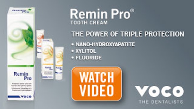 | | | | | | | Sponsored | | | | Remin Pro contains Nano-hydroxyapatite (calcium and phosphate), sodium fluoride, and Xylitol. These 3 proven ingredients are effective against demineralization and erosion. Individually Nano hydroxyapatite fills superficial lesions; sodium fluoride seals open dentin tubules and Xylitol has bacteriostatic effects. Benefits include no risk of a milk protein allergy, the ability to create saliva stimulation and much, much more. |