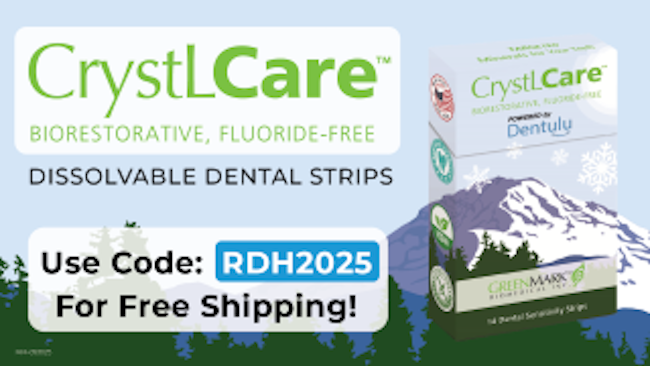 | | | | Sponsored | | | | CrystLCare™ Biorestorative, Fluoride-Free dissolvable dental strips. Enamel repair and sensitivity relief powered by bioavailable calcium and phosphate ions, forming hydroxyapatite in situ through targeted remineralization via mineral-loaded starch particles. Quick and easy application; scientifically proven; remineralizes enamel; treats dental hypersensitivity; great for pre/post SRP & whitening. |